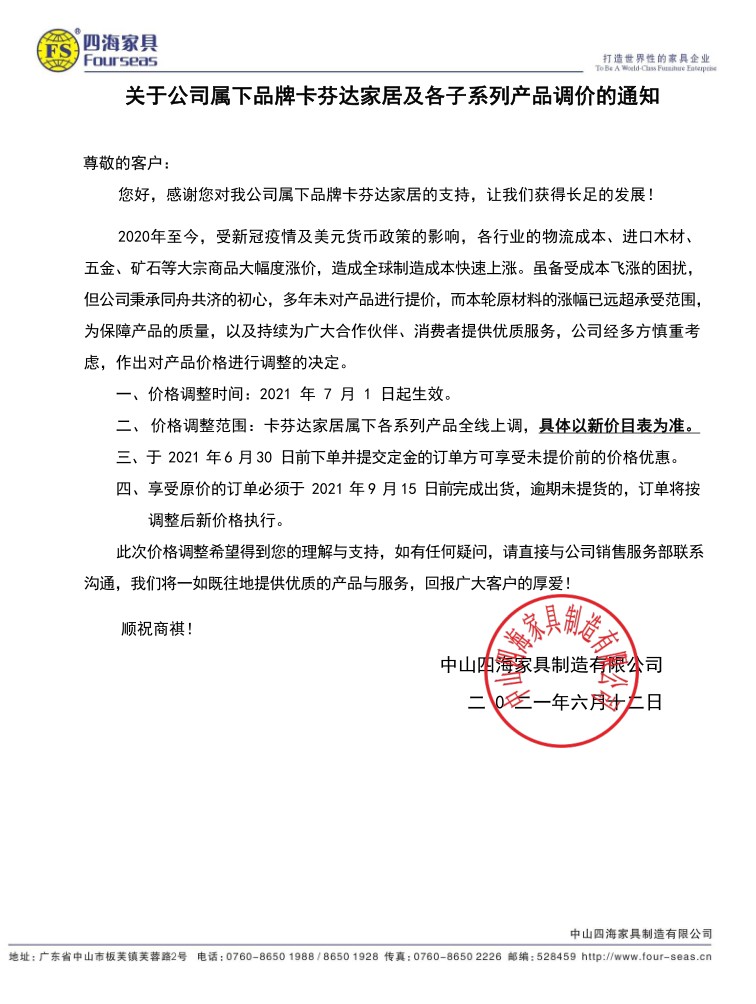 關于公司屬下品牌卡芬達家居及各子系列產品調價的通知