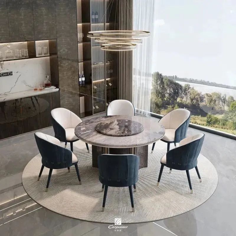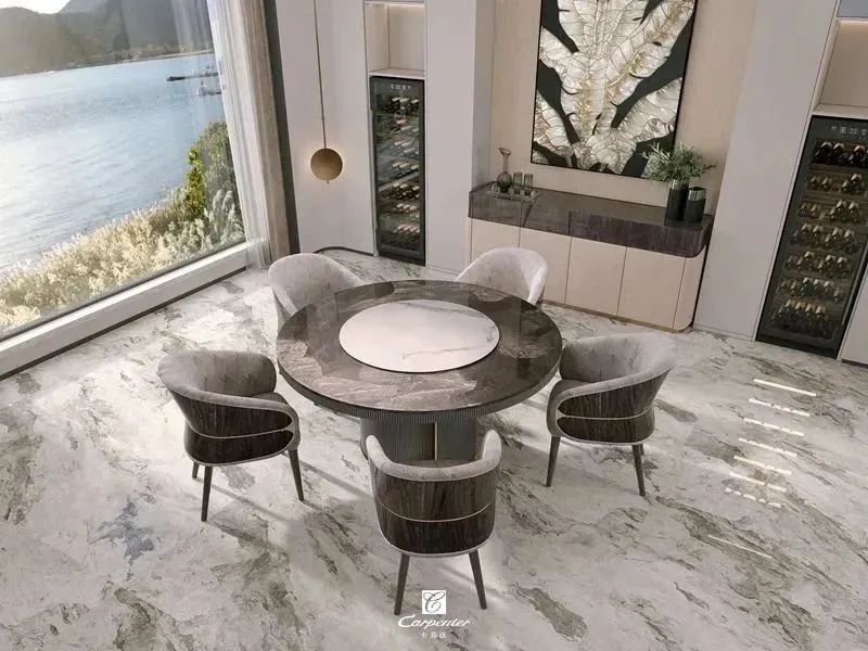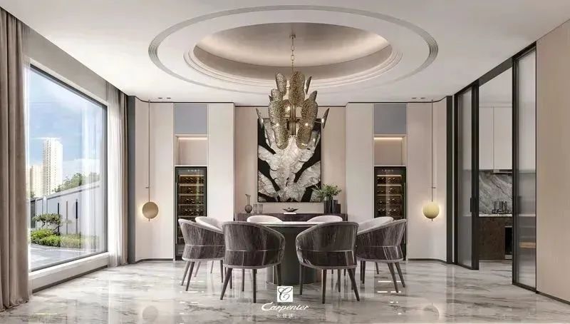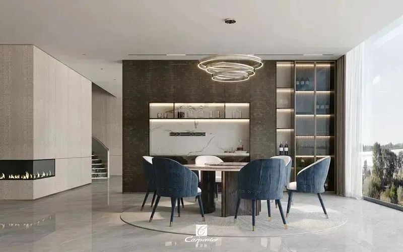 設(shè)計師通過材質(zhì)選擇、色彩運用和軟裝搭配,演繹高級輕奢風(fēng)。注重空間與功能的結(jié)合,餐邊柜、酒柜及餐桌椅井然有序、整齊劃一,滿足用餐、收納、展示等多重需求。