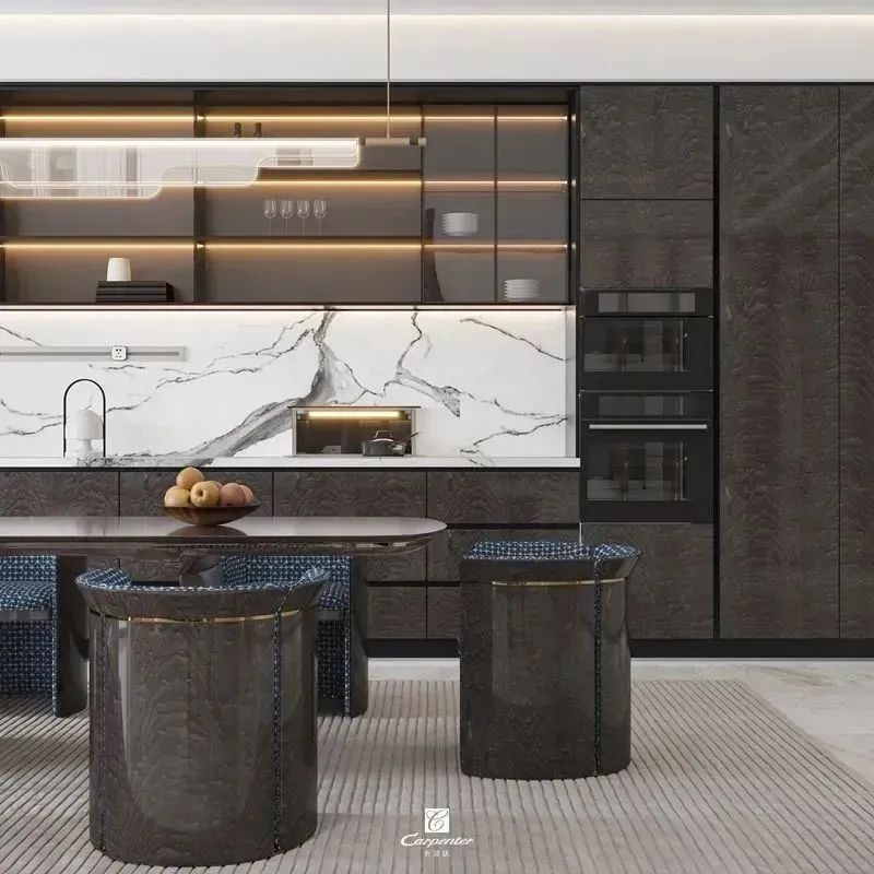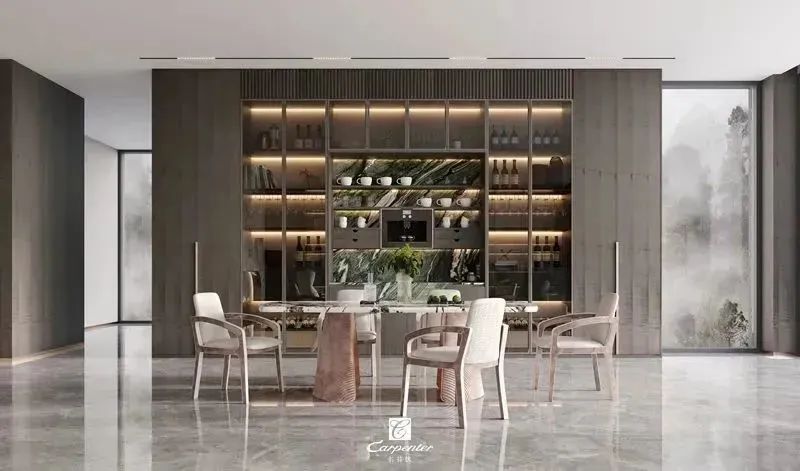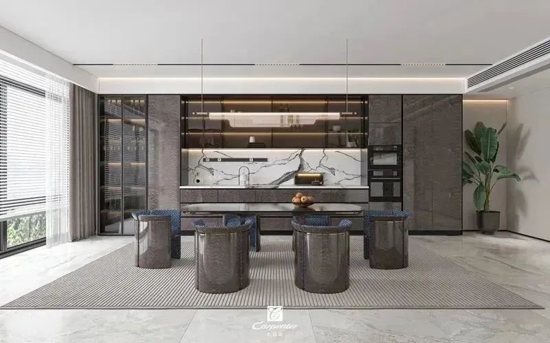 深棕色亮光的定制柜、金邊點綴的餐桌椅、間隔使用的玻璃門,細節(jié)中透露著浪漫,打造高級精致的輕奢風(fēng)餐廳,營造情調(diào)十足的用餐氛圍,用餐也自帶精英范兒。